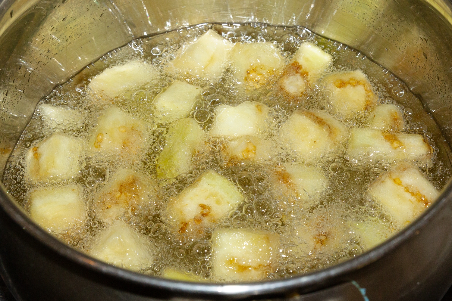 Баклажан нарезаем на кубики. Солим, даем постоять 10-15 минут, чтобы из них вышла влага. После этого добавляем к баклажану кукурузный крахмал.