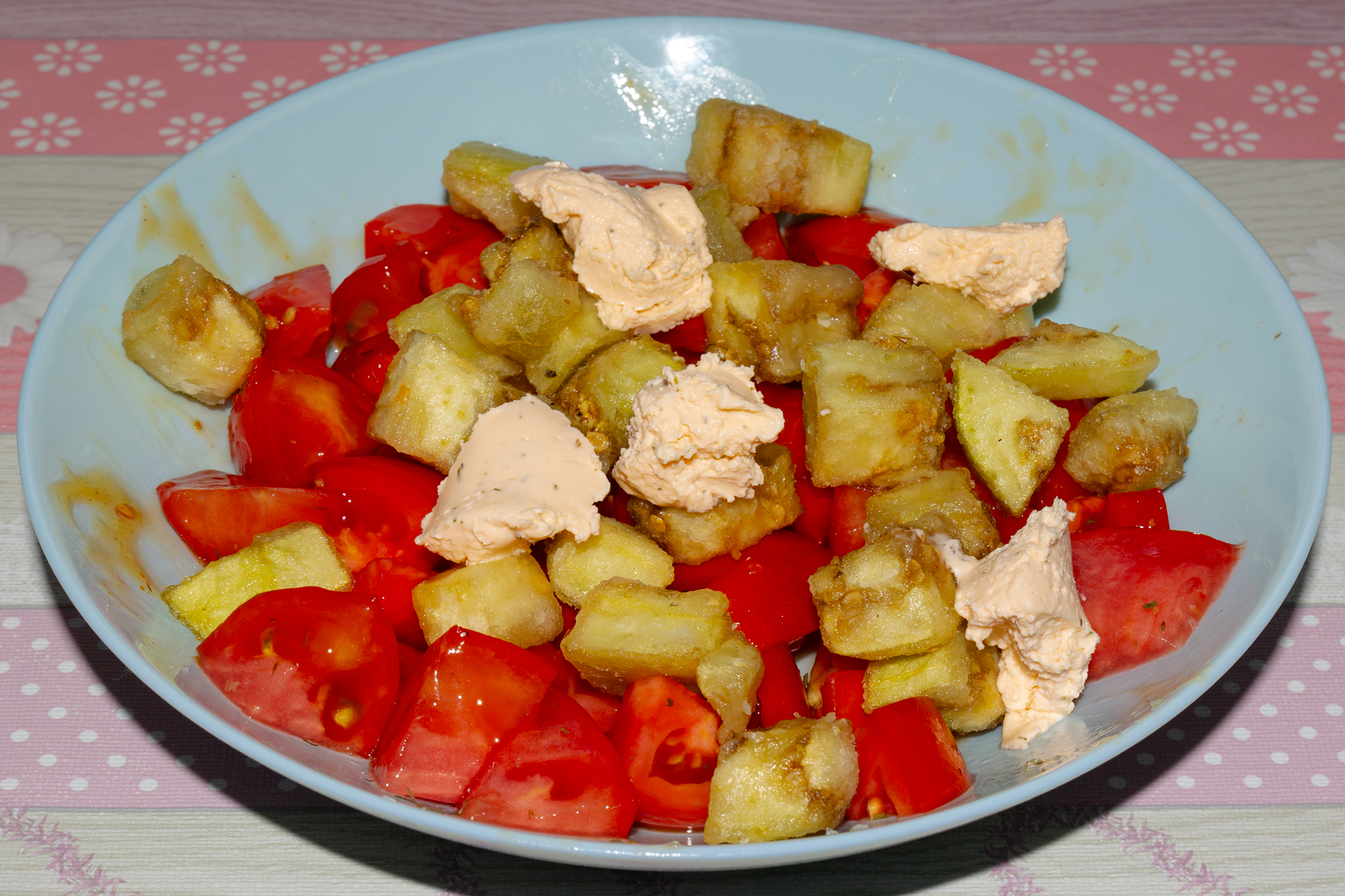 В отдельную тарелку выкладываем зелень, помидоры, готовый баклажан и сверху выкладываем творожный сыр порциями.