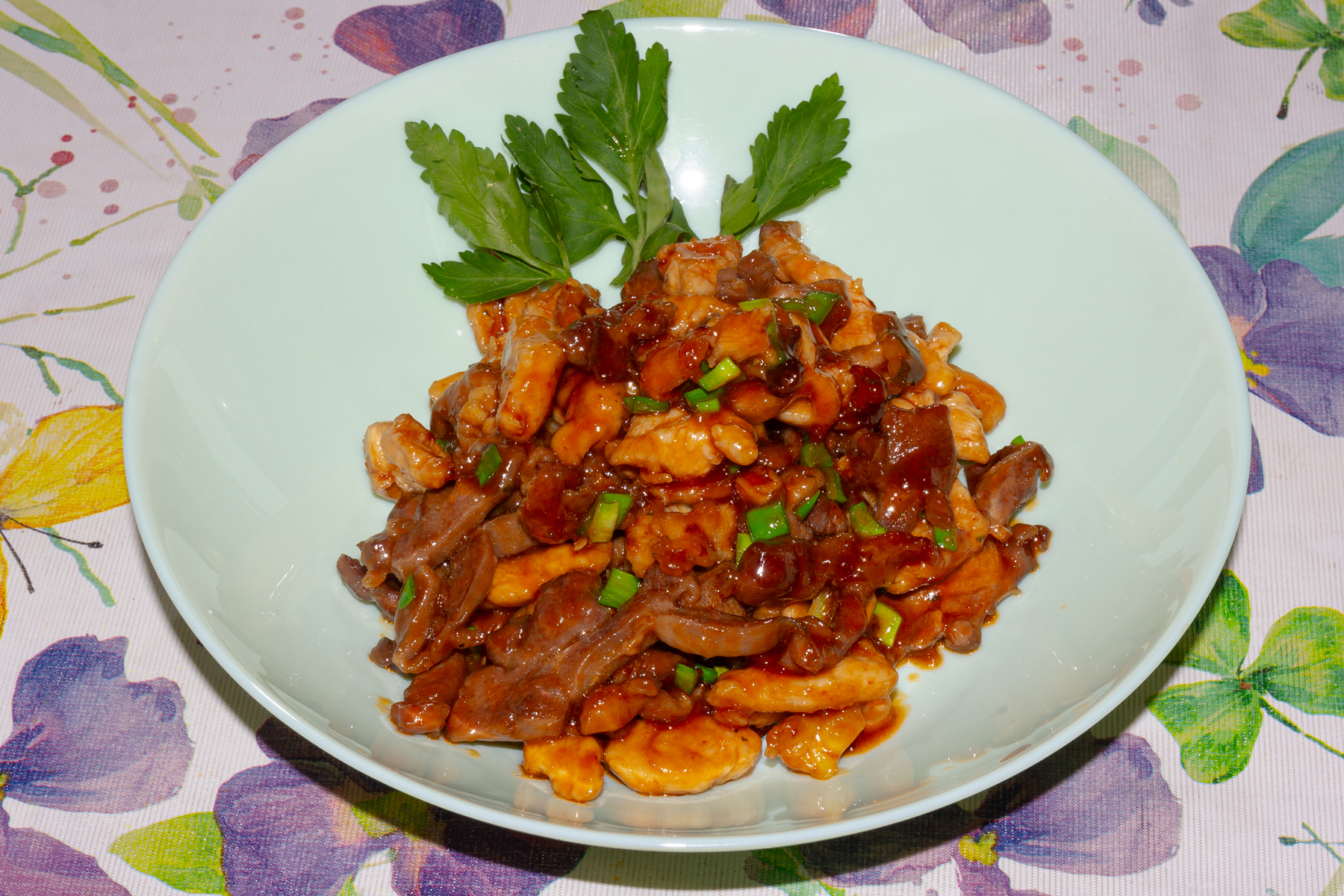 Нарезать куриное филе на небольшие кусочки. Обжарить нарезанное филе на масле почти до полной готовности. Переложить филе на тарелку. На ту же сковородку, где вы только что обжаривали курицу, влить соевый соус, воду, уксус, мед, тонко нарезанный имбирь. Помешивать будущий соус пока мед растворится. Добавить в соус курицу, уменьшить огонь, почти до самого маленького и тушить курицу минут 15-20. Украсить зеленью.