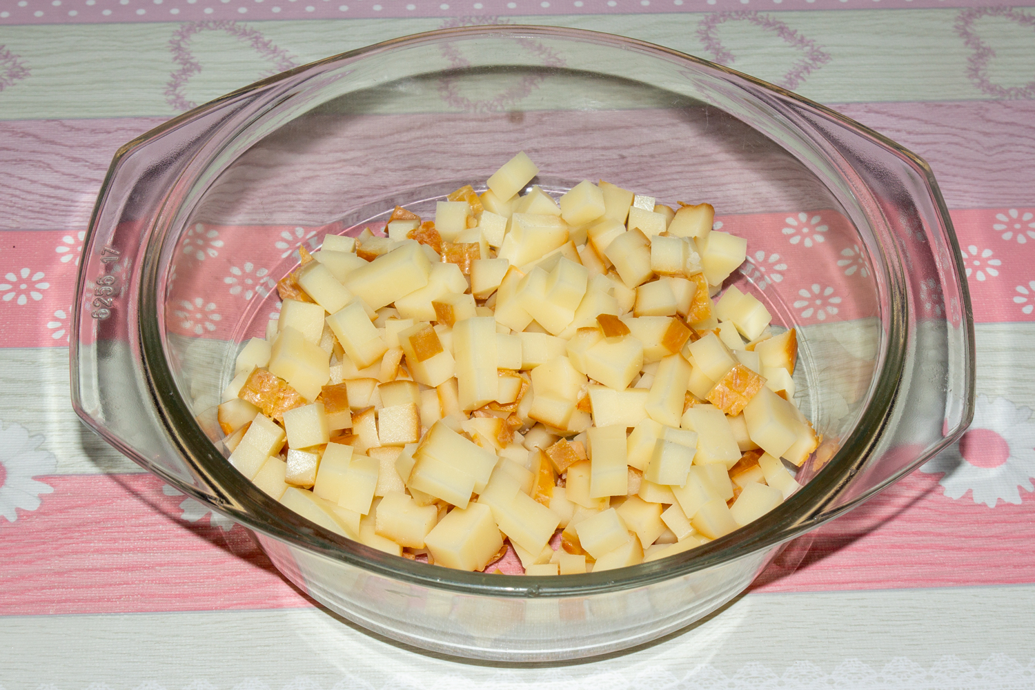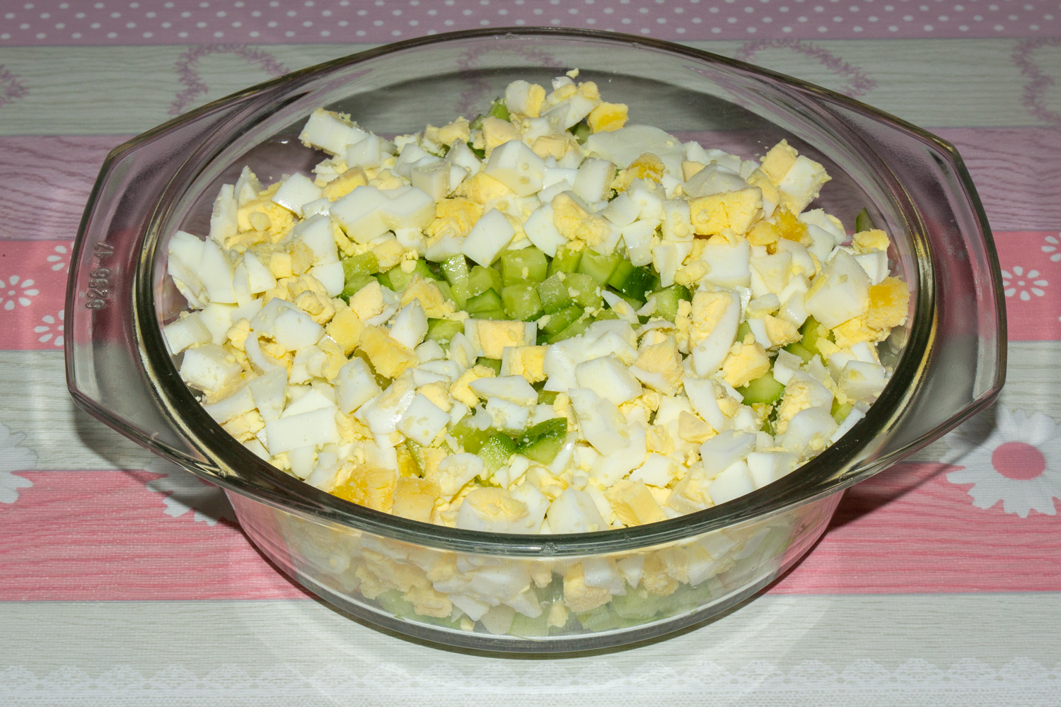 Соедините в глубокой миске куриное филе, огурец, зелёный лук, сыр сулугуни и яйца. Перемешайте все ингредиенты, добавьте сметану.