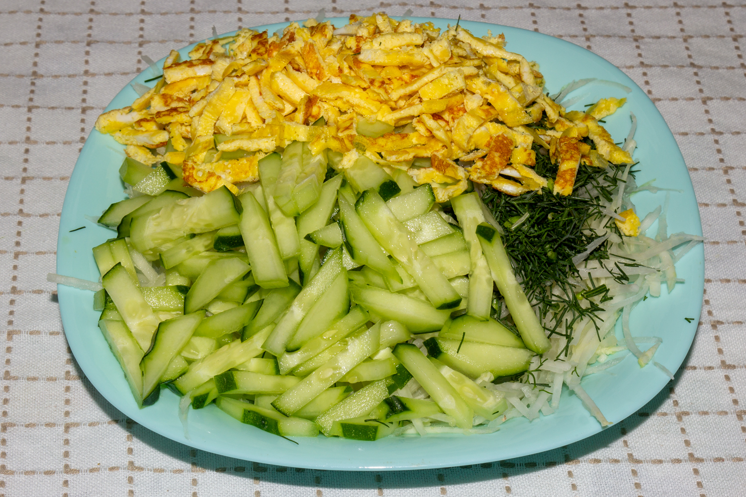 Укроп нарубите мелко, добавьте к огурцам с луком. Яйца взбейте с солью и приготовьте яичный блин.