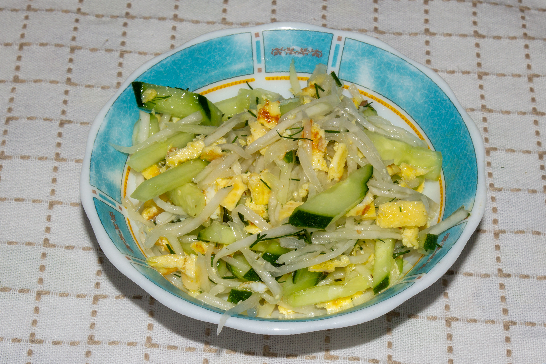 Огурец нарежьте тонкой соломкой, зеленый лук мелко нарубите, сложите в глубокую миску. Нарежьте капусту тонкой соломкой или натрите на терке для корейской моркови.