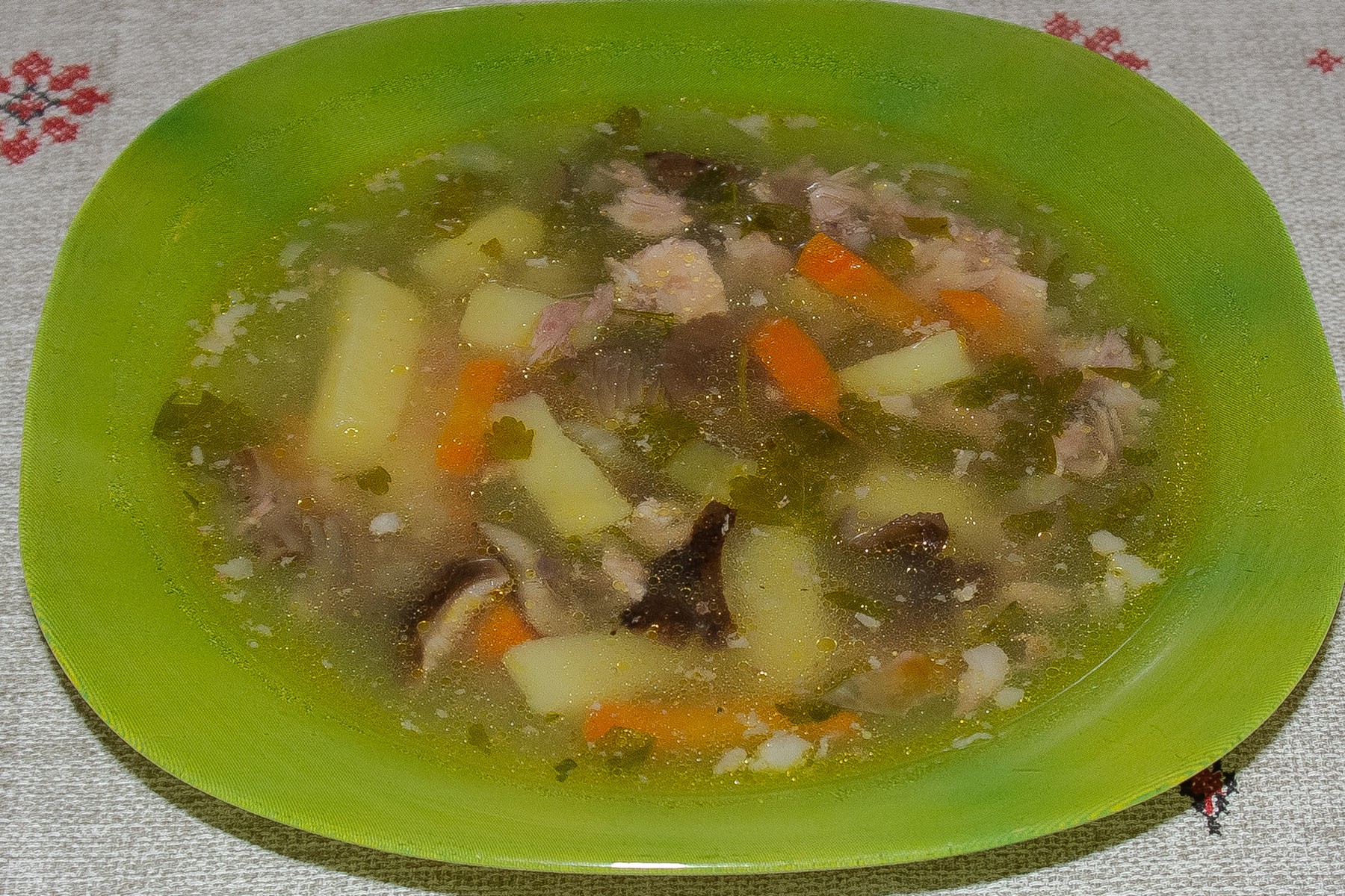 Сварить курицу до состояния полуготовности. Морковь и коренья натереть, репчатый лук порезать и обжарить все это на топленом масле.