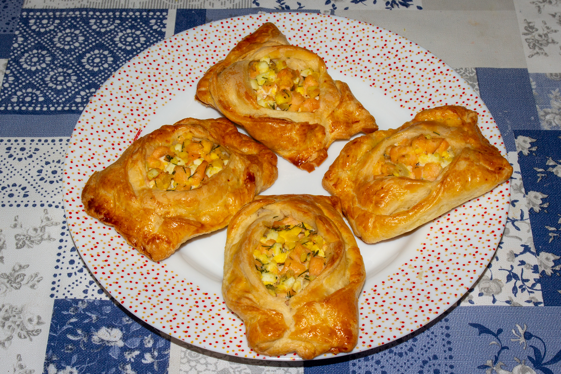 Смажьте пирожки яйцом и отправьте в холодную духовку, включив ее на 170 градусов. Выпекайте слоеные расстегаи с рыбой до зарумянивания - минут 30-35, ориентируйтесь на свою духовку.