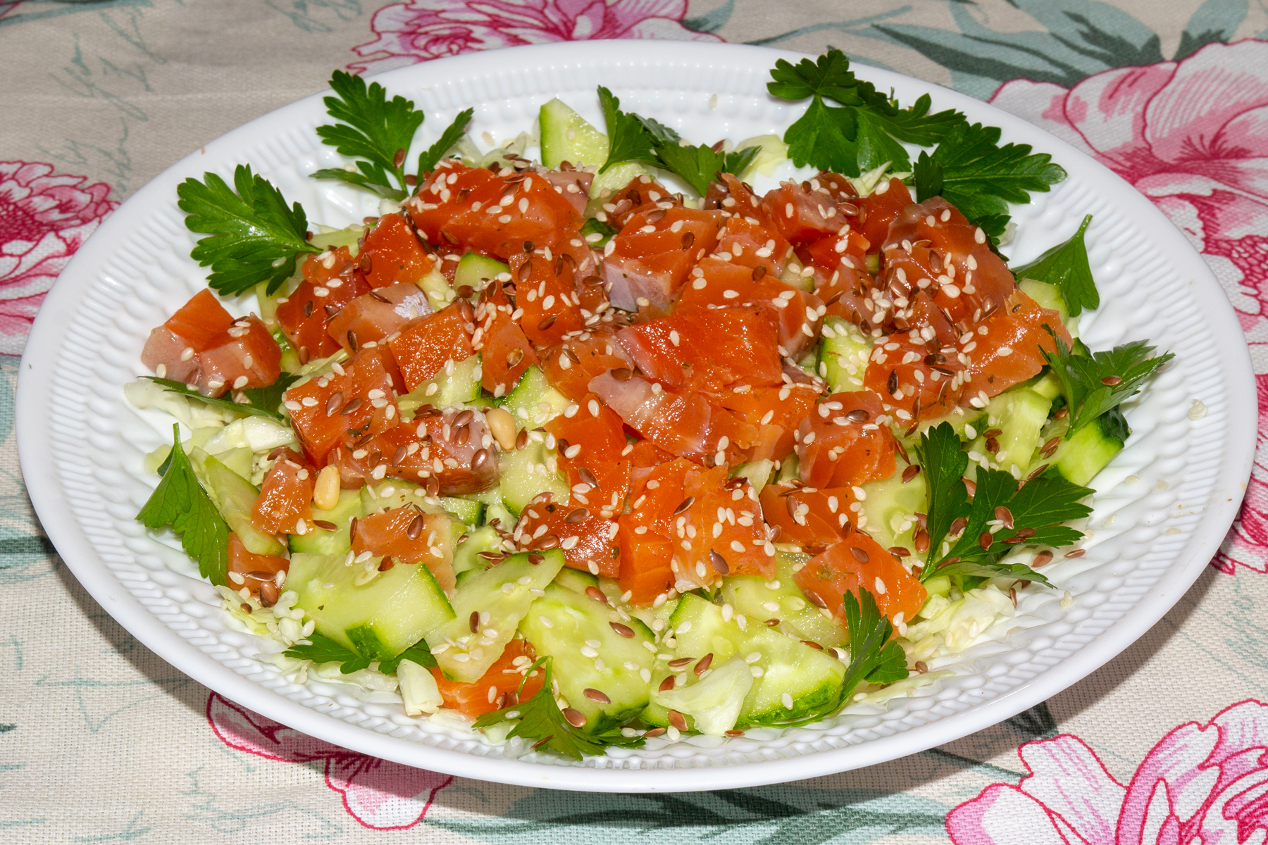 Рыбу и огурцы нарежьте кубиками. Салат нарвите и выложите на тарелку. Масло смешайте со специями. Ингредиенты смешайте, заправьте маслом и посыпьте кунжутом. Украсьте зеленью.