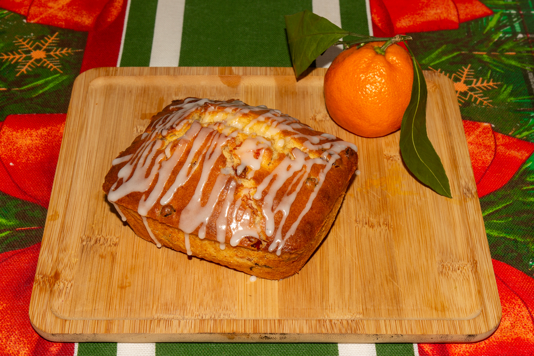 Когда кекс готов, даем ему остыть в форме минут 15. После выкладываем кекс на блюдо. Украсить кекс можно глазурью. Она придаст приятную кислинку, которая идеально балансирует сладость теста с сухофруктами.