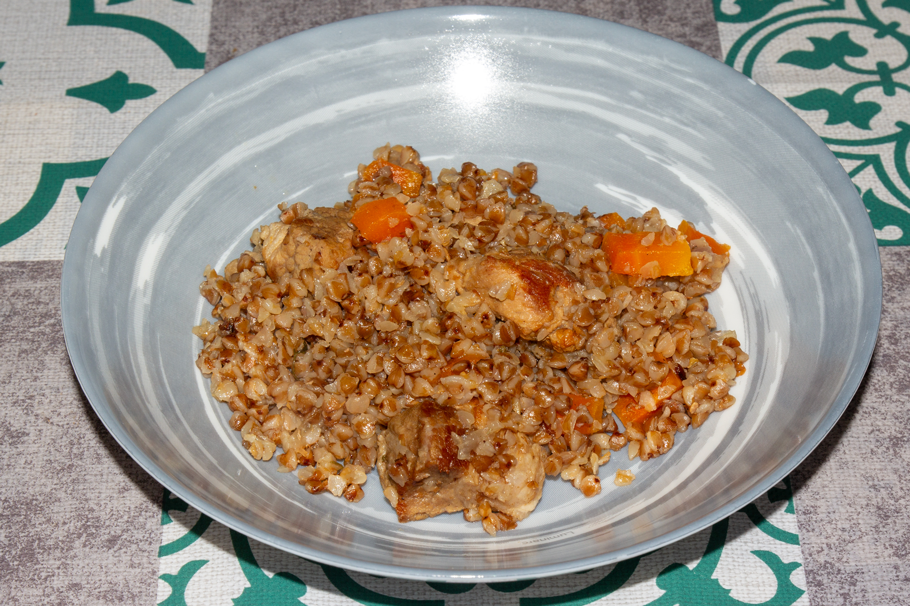 Крупа: Промойте гречку и всыпьте её прямо в сковороду (или казан) к мясу и овощам. Перемешайте и прогрейте пару минут, чтобы крупа впитала масло и мясной аромат.