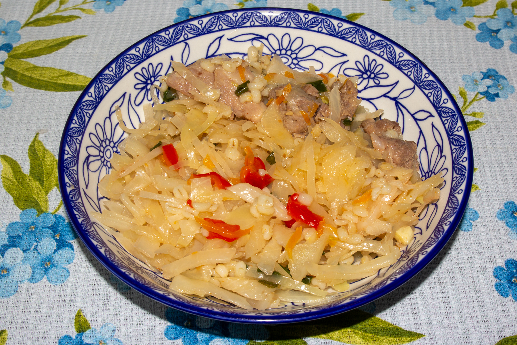 Свинину нарежьте кубиками 3–4 см. Лук нарежьте мелким кубиком. Морковь натрите на крупной тёрке. Перец нарежьте мелким кубиком. Капусту тонко нашинкуйте.