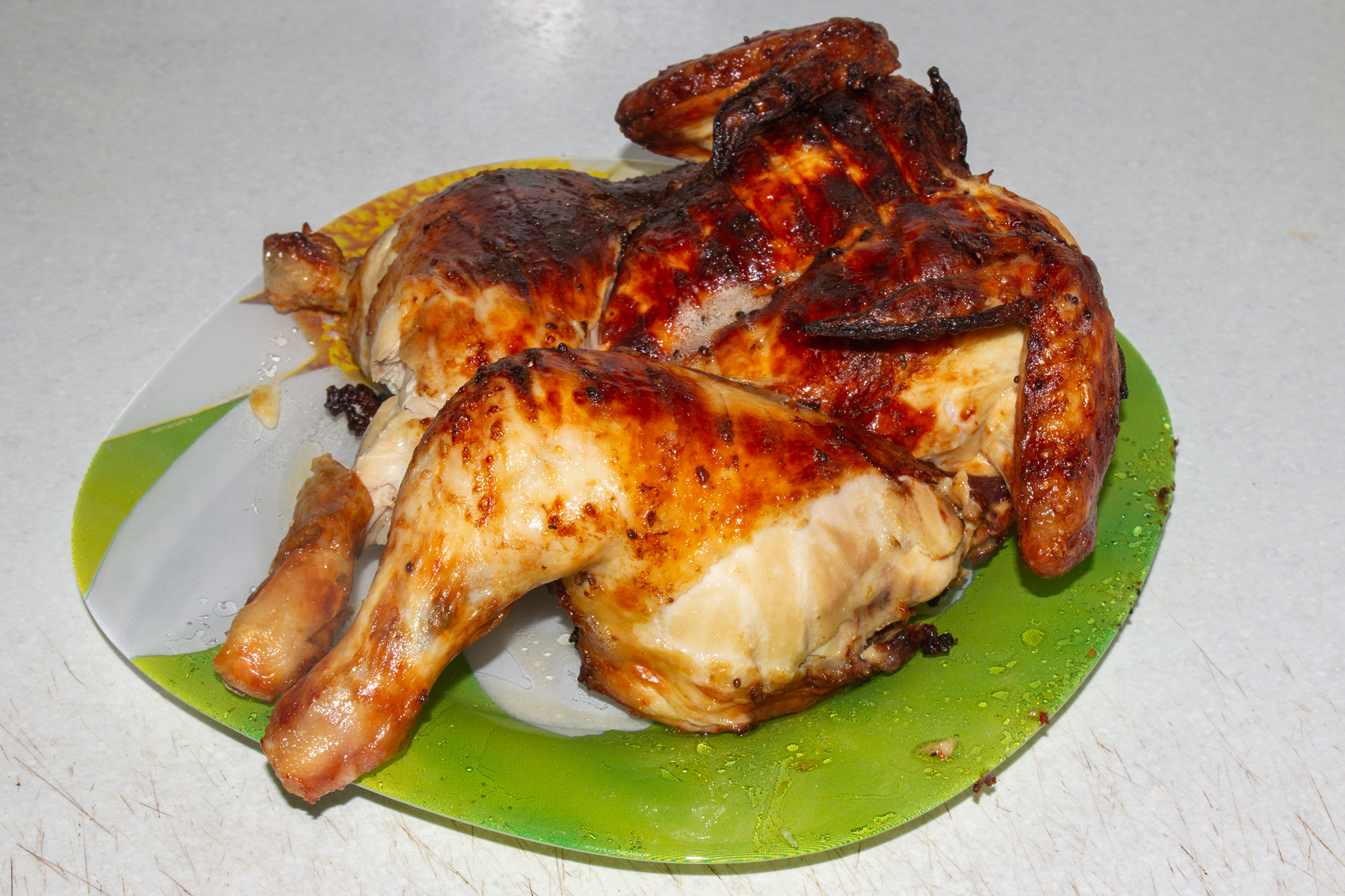 Затяните пищевой плёнкой и уберите в прохладное место на несколько часов. В чашу аэрогриля установите решетку и сбрызните ее маслом. Уложите курицу грудкой вверх. Установите время приготовления — 30 минут, при температуре 160 градусов. Готовьте до окончания программы. Через 30 минут достаньте курицу, она должна уже быть слегка румяной.
