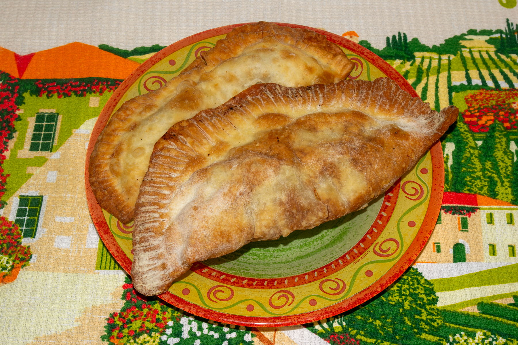 Фарш переложите в глубокую миску. Лук измельчите в блендере или натрите на крупной тёрке. Добавьте к фаршу подготовленный лук, соль и молотый перец по вкусу. Тщательно перемешайте. Затем частями добавьте холодную воду. Фарш не должен быть густой, он должен получиться немного жидким, но держать форму. Благодаря этому чебуреки получатся у нас очень сочные. Тесто ещё раз обомните и разделите на 12-14 частей, в зависимости от желаемого размера чебуреков. Каждый кусочек теста раскатайте в тонкий круг. На один край выложите начинку. Накройте начинку тестом. И вилкой скрепите края. Аналогично сформируйте оставшиеся чебуреки.