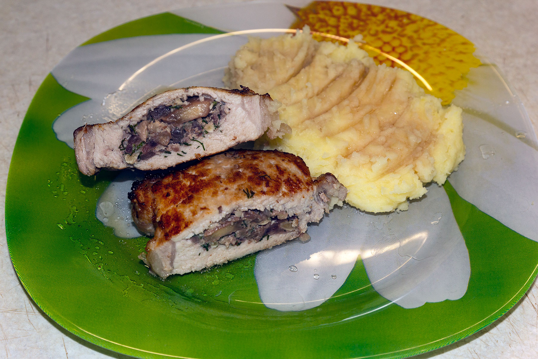 Мясо нарезать на порционые куски по 150 г. Сверху, где была косточка сделать надрез в виде кармашка. Кармашки начинить смесью.