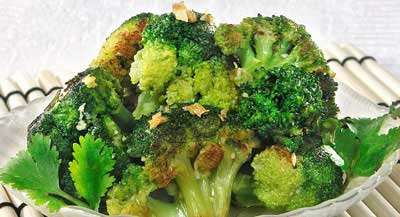 Брокколи промыть и разделить на соцветия. Чеснок очистить и измельчить. Обжарить брокколи в 2 столовых ложках разогретого до 160 °С масла в течение 5 минут. Вынуть, дать маслу стечь. Чеснок обжарить в оставшемся масле, затем добавить 3 стакана воды, соль, глютамат натрия и брокколи. Тушить, постоянно помешивая, до готовности.