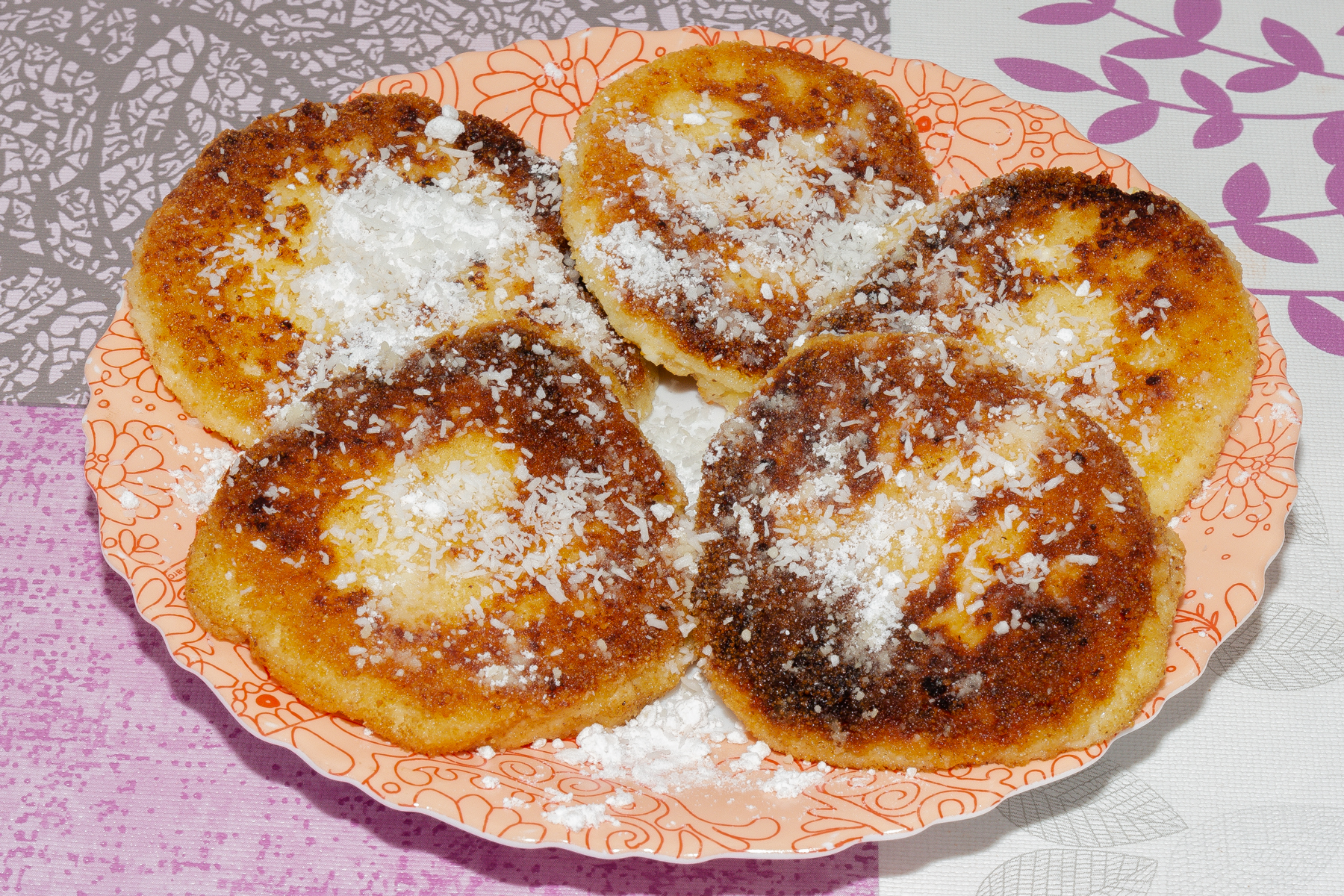 Творог залить сильно горячим молоком и дать постоять. Добавить по вкусу соль и сахар, вбить яйца и, подсыпая по ложке муку, вымешать тесто. Дать тесту созреть около получаса и разделать сырники. Жарить сырники в хорошо разогретом растительном масле, подрумянивая их с обеих сторон.