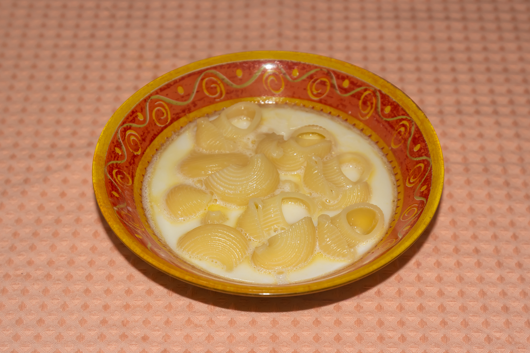 Лапшу перебрать, положить в кипящее молоко, добавить соль, сахар и варить в течение 20-25 минут. При подаче к столу положить масло. Если вместо лапши засыпана вермишель, то варить следует 12-15 минут.