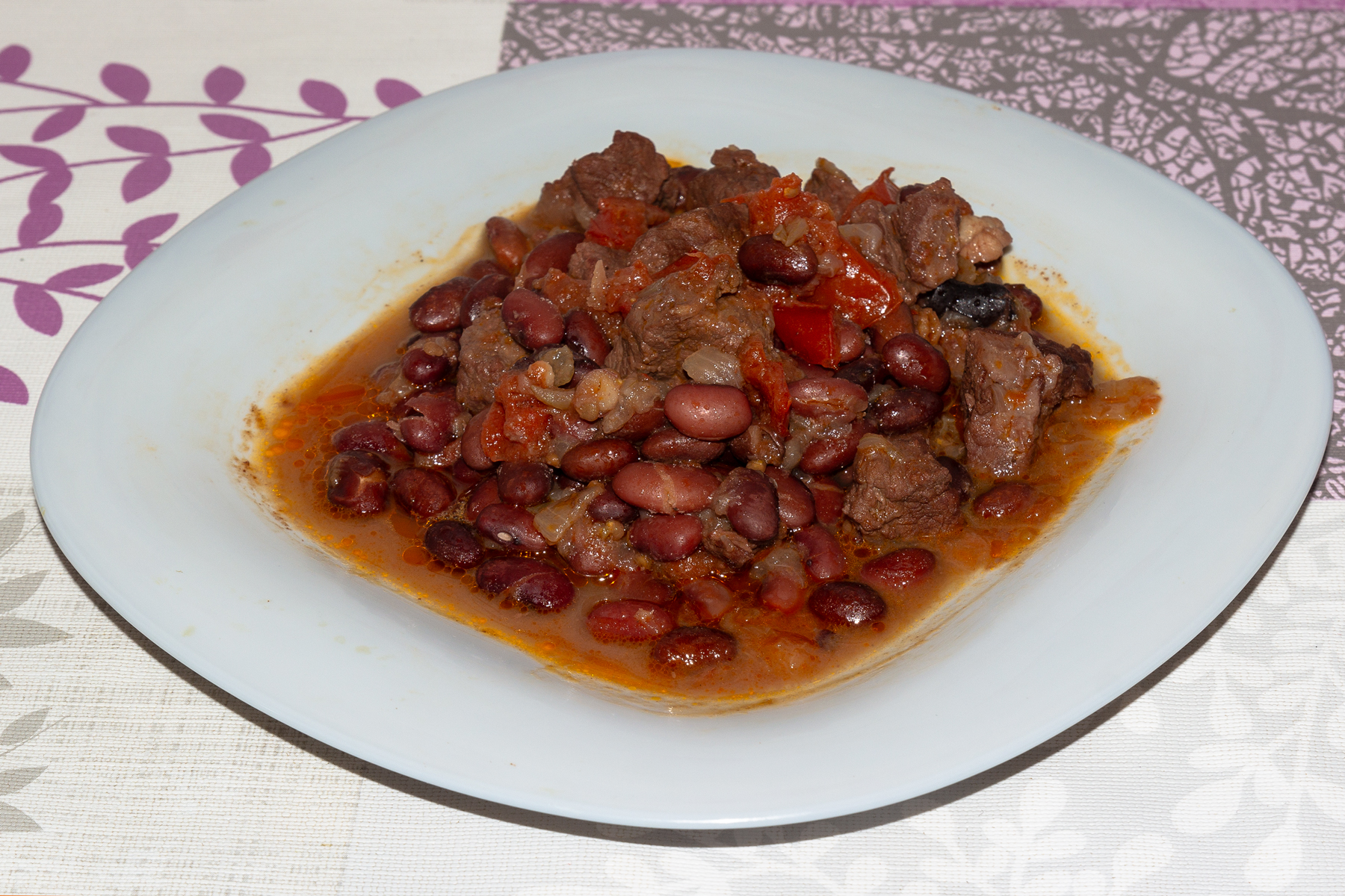 Нарезанную небольшими кусками баранину посолить, посыпать перцем, обжарить на масле, переложить в неглубокую кастрюлю, добавить предварительно замоченную фасоль, 2 1/2 - 3 стакана воды и варить около часа. Затем добавить слегка поджаренный лук,