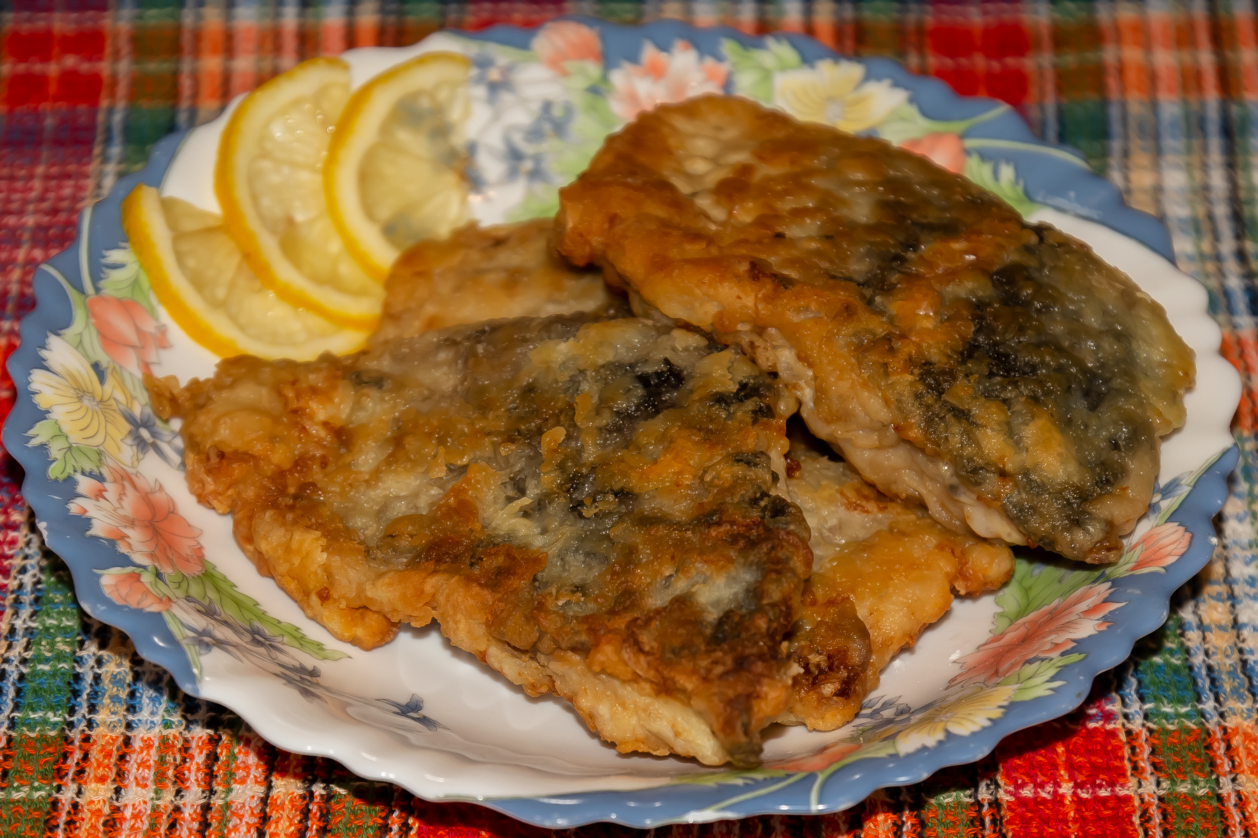 Подготовленную рыбу промыть, отсушить на салфетке, посолить, посыпать перцем, обвалять сначала в муке, а затем, смочив яйцом, разведенным молоком (1/4 стакана на 1 яйцо), обвалять в сухарях.
