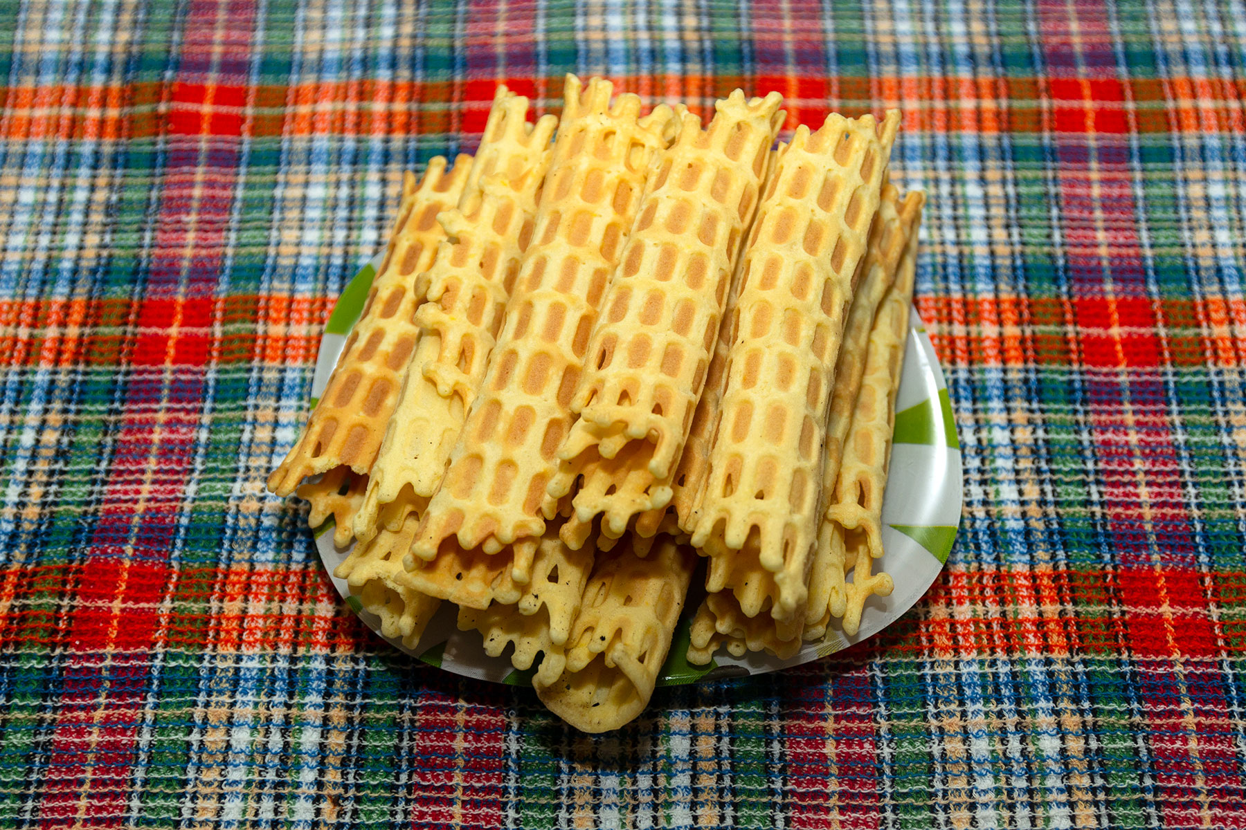 Вафли снимаем на полотенце и сразу сворачиваем в трубочку.