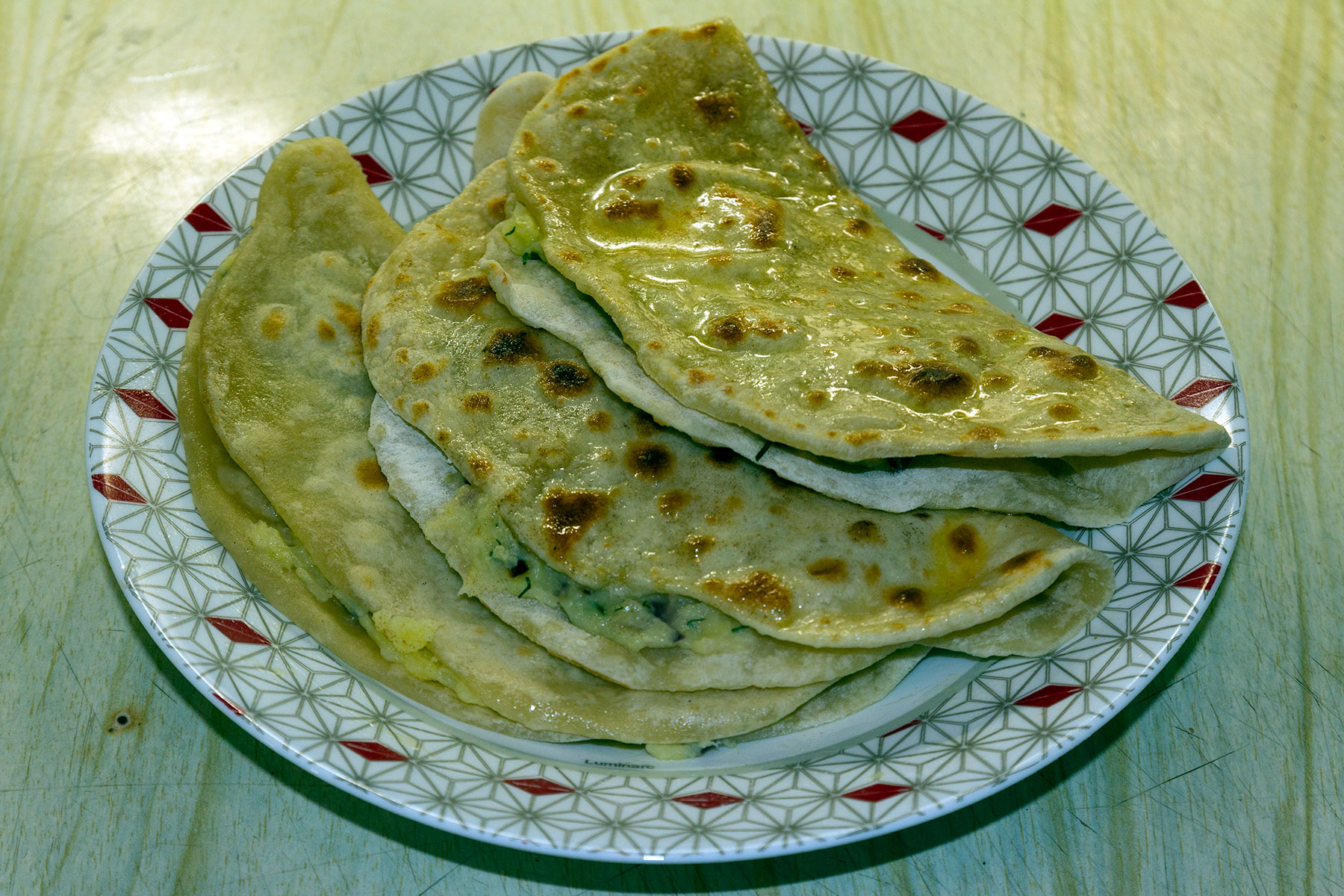 Лепешку согнуть вдвое, на половину лепешки положить картофельное пюре толщиной с палец и закрыть второй половинкой.