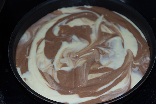 На смазаный противень поочередно выкладывать столовой ложкой белое и темное тесто.