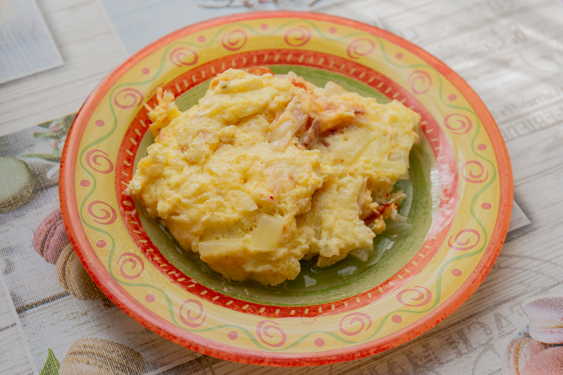 Смешать мелко покрошенный бекон, сыр и лук. Положить их на сковороду. Разбить яйца и смешать их с молоком и специями с помощью миксера. Полученную смесь вылить на бекон. Жарить до готовности.