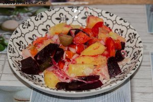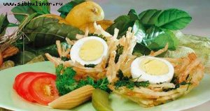Баклажаны обмыть, разрезать вдоль, вынуть из середины часть мякоти, изнутри натереть солью и дать полежать несколько минут. В промытые баклажаны положить начинку, после чего уложить их на противень в один ряд, залить соусом или сметаной и припустить в жарочном шкафу. Готовые баклажаны охладить и посыпать зеленым луком. Приготовление начинки. Коренья и репчатый лук мелко нарезать, спассеровать на растительном масле. Мелко нарезанную капусту, помидоры (без кожицы), нарезанные дольками, смешать с пассированными кореньями, луком и тушить до полу готовности, заправить солью и перцем.