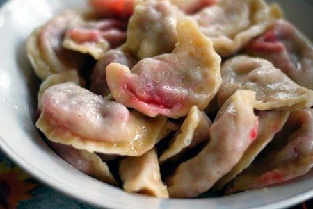 Вначале нужно промыть вишню и удалить косточки. Косточки от вишни не выбрасываются, а складываются в отдельную посуду. Потом засыпаем вишни сахаром и косточки, чтобы они пустили сок и оставим на 3-4 часа. Тем временем приготовим тесто. Смешаем все ингредиенты и замесим тесто средней густоты. Раскатаем тесто в пласт толщиной в 1.5 мм. Чем тоньше, тем лучше. Моя бабушка так ухитрялась раскатывать тесто, что пельмени получались практически воздушными и их можно было съесть больше, чем 25 штук. Приготовленное тесто нарежем на квадратики размером 5х5 см. Каждый квадратик слегка смазывают разболтанным яйцом и кладут в цент вишню. Можно и по две. Готовый вареник складывают треугольником и защепляют. Варят вареники в большом количестве подсоленной воды. Когда вареники готовы, они всплывают.