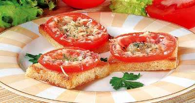 Пшеничный хлеб нарезают квадратными кусочками толщиной 1 см и обжаривают в масле. Гренки накрывают кружочками помидоров, посыпают сыром и подрумянивают в жарочном шкафу.