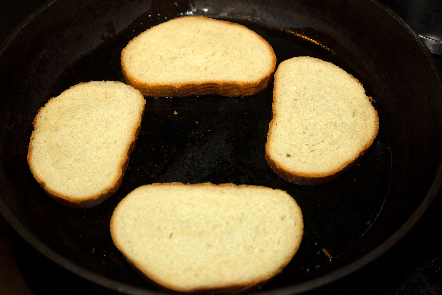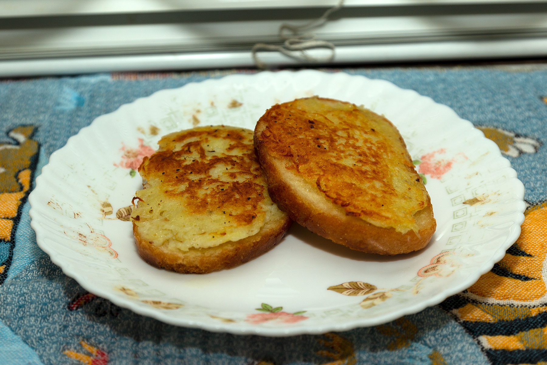 На необжаренную сторону хлеба намазывается картофельная масса, слегка придавливается и кладется на сковородку подрумяненной стороной вверх, картошкой вниз.