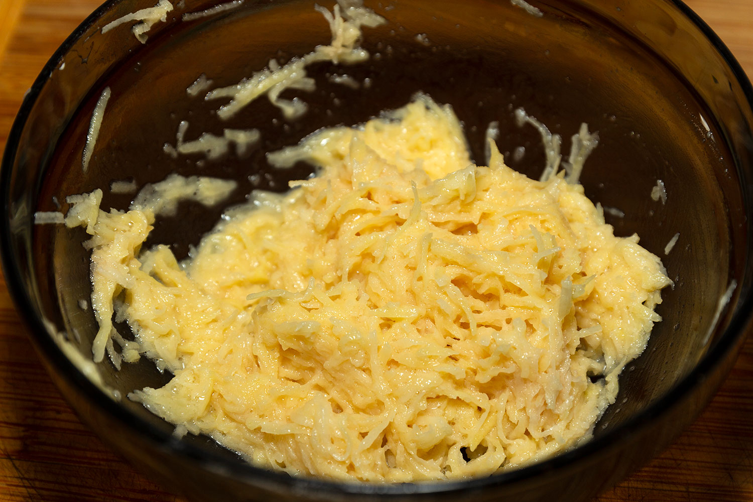 Сырой картофель натирается на мелкой терке, отжимается. Яйцо взбивается и перемешивается с тертым картофелем. Солится и перчится по вкусу.