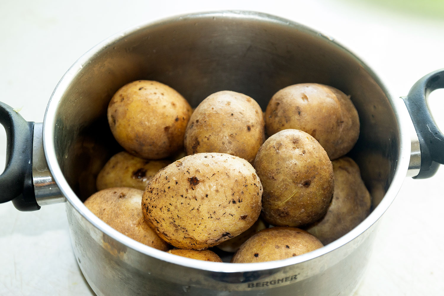 Сварить картофеля, очистить от кожуры и пропустить горячим через мясорубку или размять вилкой.