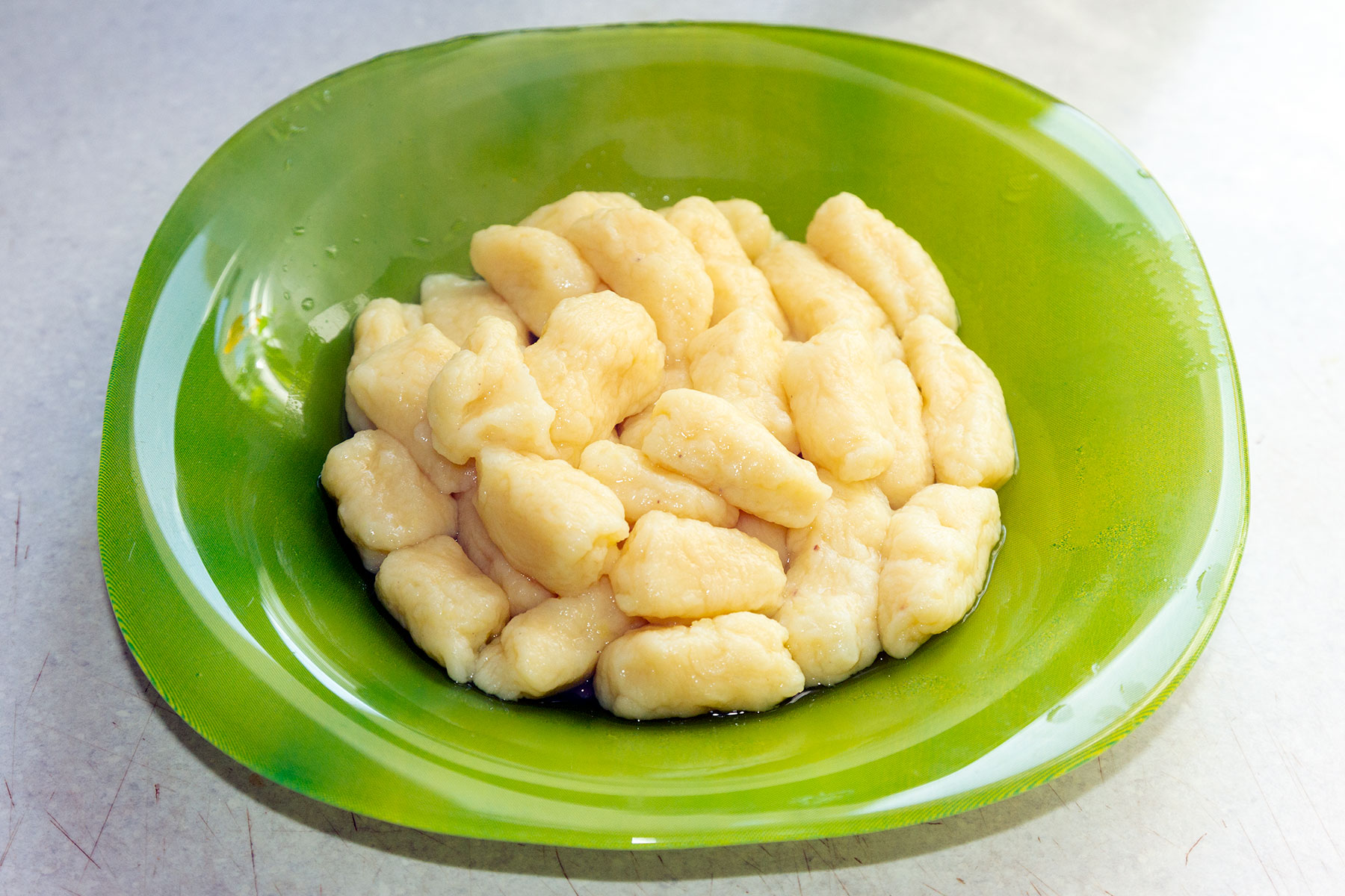 Картофельная масса не должна прилипать к рукам. Кухонный стол подпылить мукой и сформовать из картофельной массы длинные колбаски, толщиной с палец. Затем нарезать на кусочки длиной 4-5 см (кнедли можно сформовать и в виде шариков, величиной с грецкий орех).