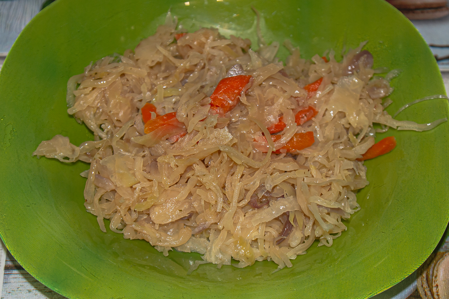 добавляют шинкованную капусту, шинкованные белые коренья, соль и тушат, подливая воду. Муку прогревают с жиром, охлаждают, разводят водой и добавляют в капусту. После этого все тушат до загустения. В конце тушения заправляют капусту уксусом по вкусу, сахаром, добавляют перец и лавровый лист.
