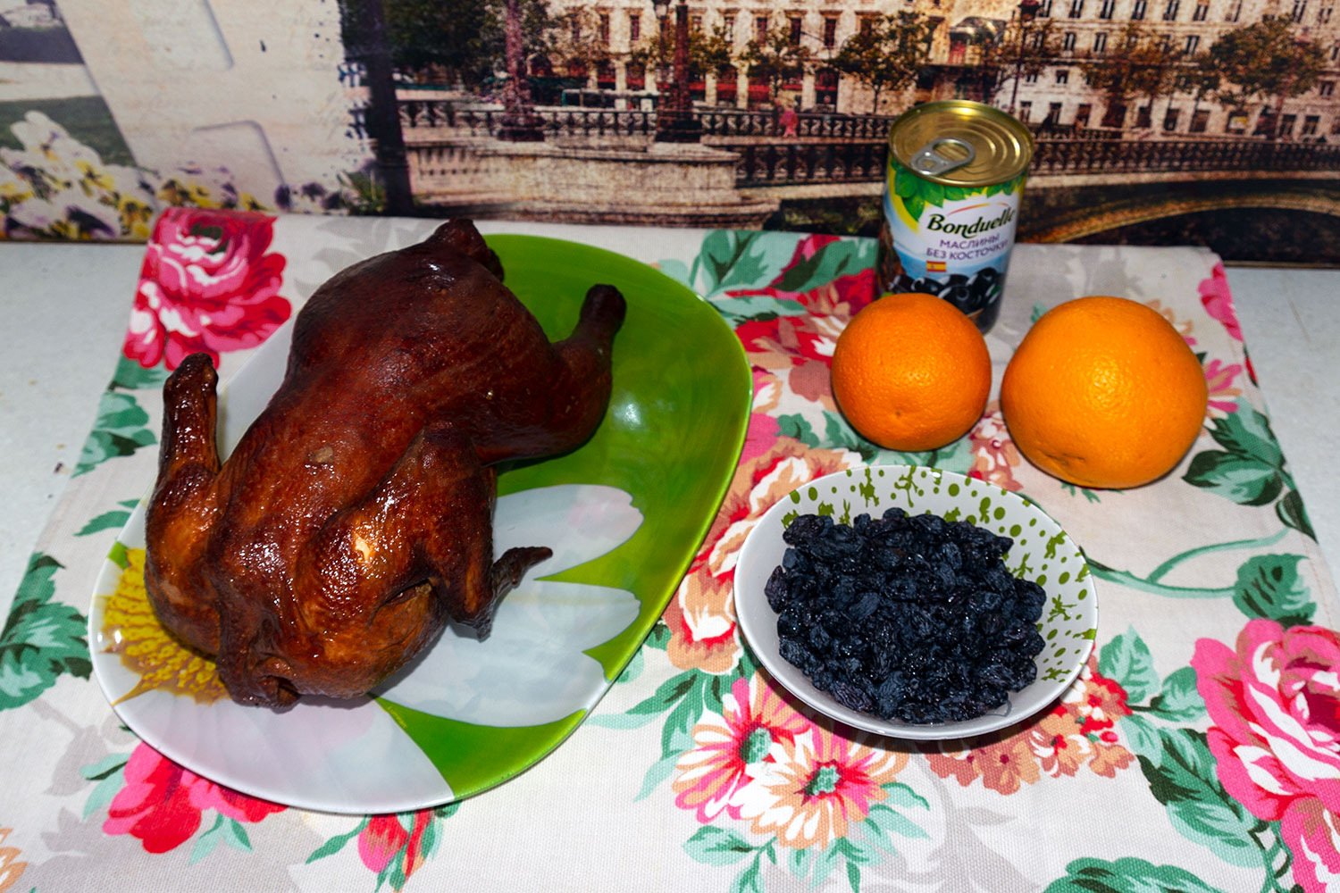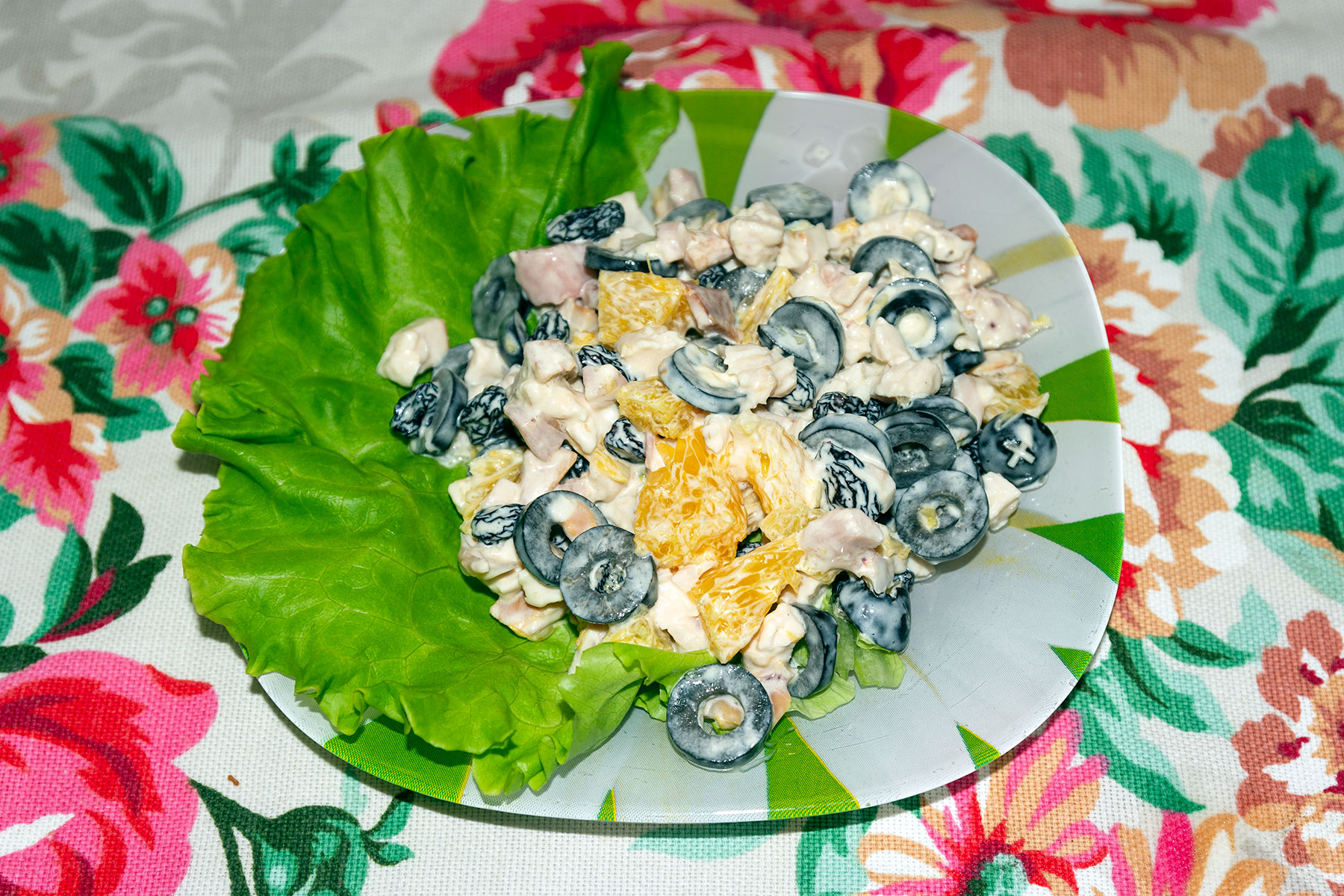 Маслины порезать вдоль на 3-4 части (колечками), добавить изюм, заправить майонезом и перемешать.