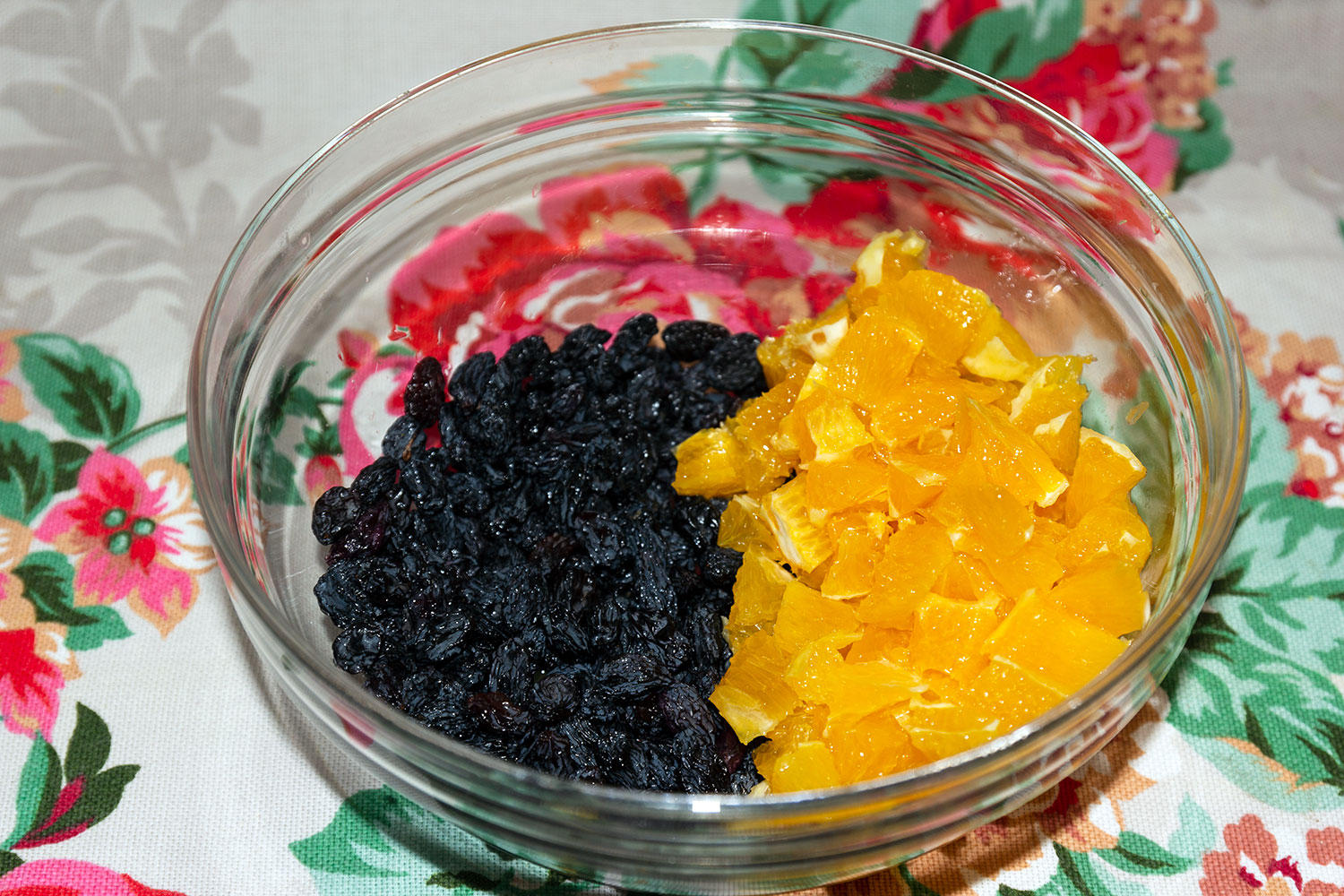 Курицу отделить от костей, порезать кубиками вместе с апельсинами.