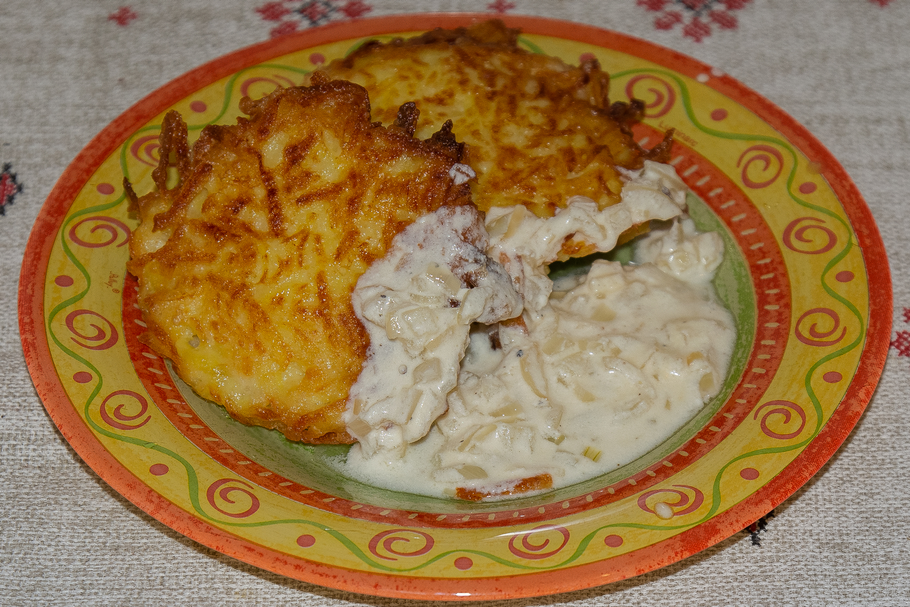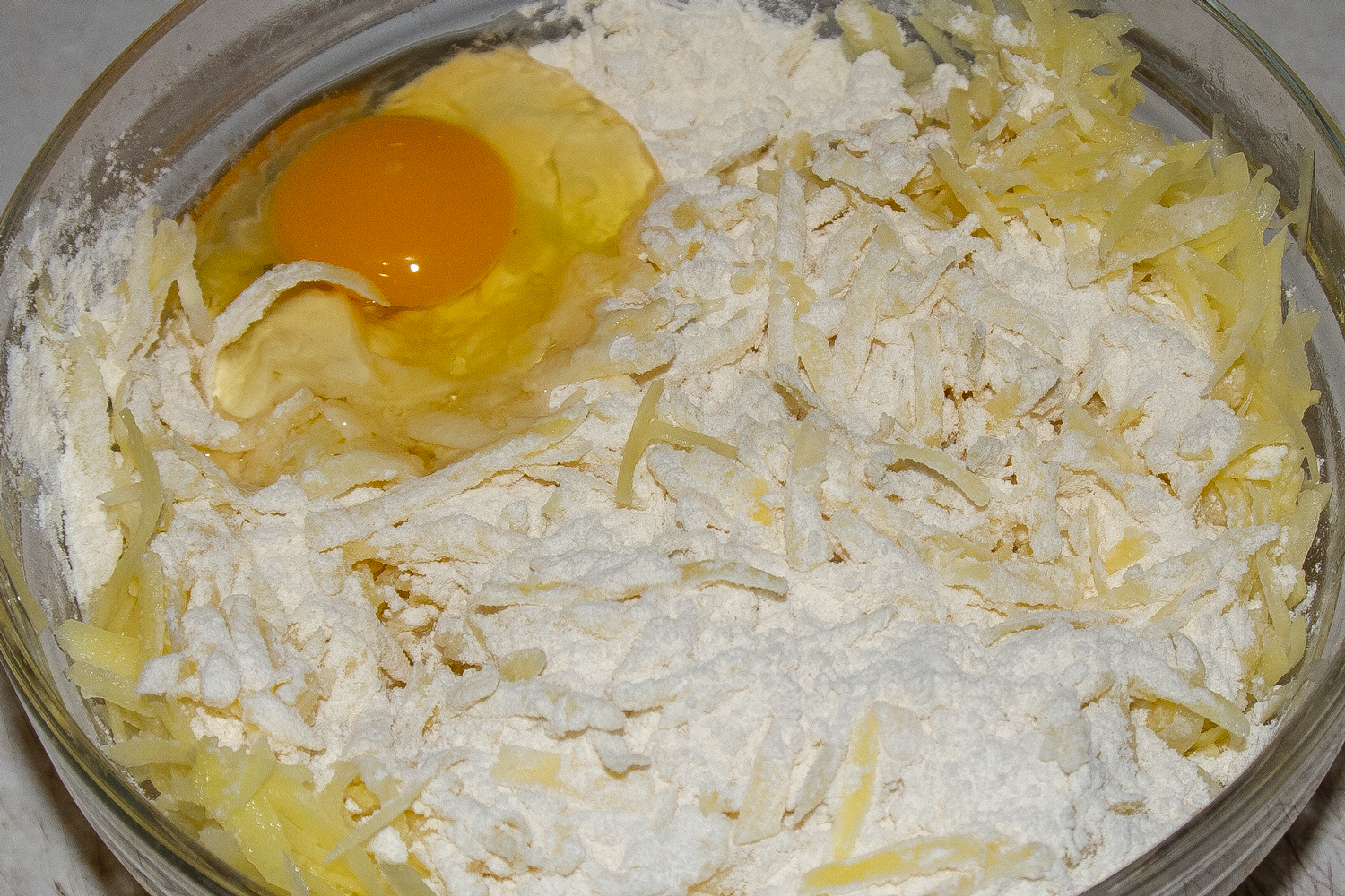Готовое или только что содранное с костей филе трески (либо другой какой рыбки - хека, минтая, на худой конец) посолить, поперчить и сбрызнуть лимонным соком. Сырой картофель очистить и натереть на терке средней степени крупности. Отжать жидкость, добавить яйцо и муку. Хорошо перемешать.