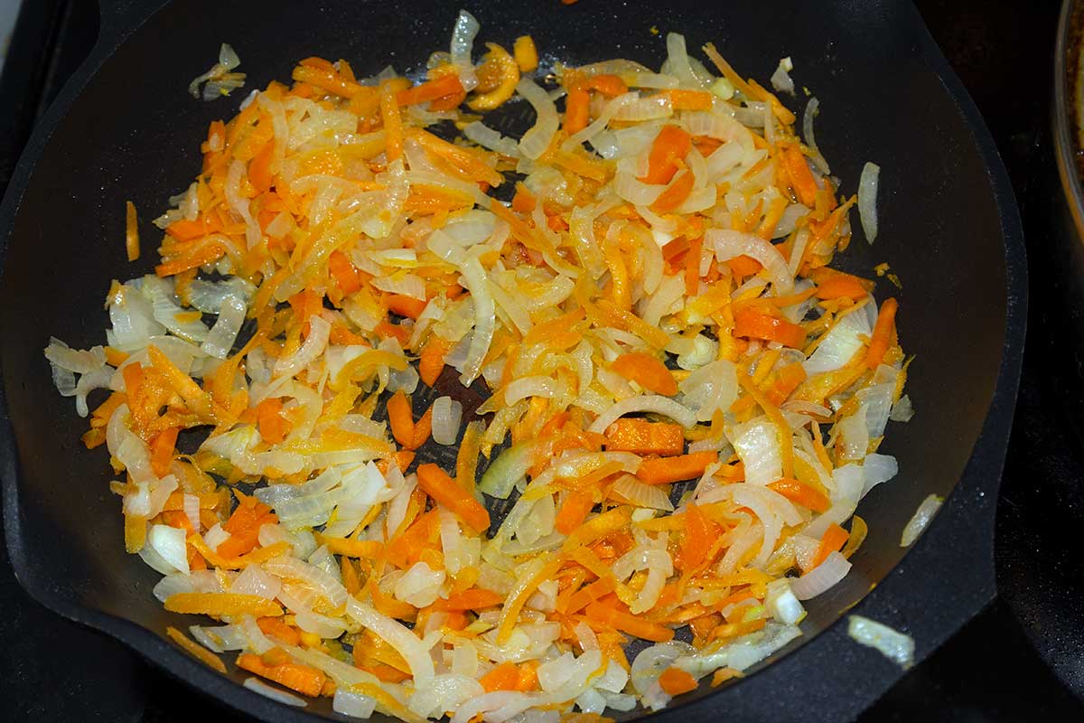 Режем лучок полукольцами, морковь - соломкой (а еще лучше потереть на терке) и все это пассеруем на сковороде.