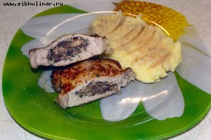 Мясо свинины нарезать на большие куски, чтобы потом было удобно сворачивать рулеты. Куски отбить, посолить и поперчить по вкусу. Оставить пропитаться. В это время готовиться начинка. На сковородку налить немножко масла, выложить грибы (грибы можно свежие, можно консервированные). Когда грибы поджарятся, положить мелко нарезанный лук. После того как лук приобретет золотистый оттенок (главное не пережарить), положить нарезанные яблоки (груши). Когда вся масса будет готова, положить кусочек сливочного масла, перемешать. Начинка готова. Разогреть духовку до 200 C. Выложить начинку на каждый кусок мяса и свернуть рулетом. Выложить рулеты на противень, помазать майонезом. Поставить в духовку на 30 минут. За 10 минут до готовности посыпать тертым сыром.