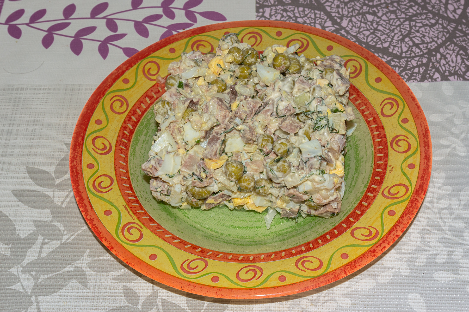 Язык отварить, очистить и нарезать кубиками. Рис отварить, добавить нарезанный язык, нашинкованный лук и яйца, горошек,