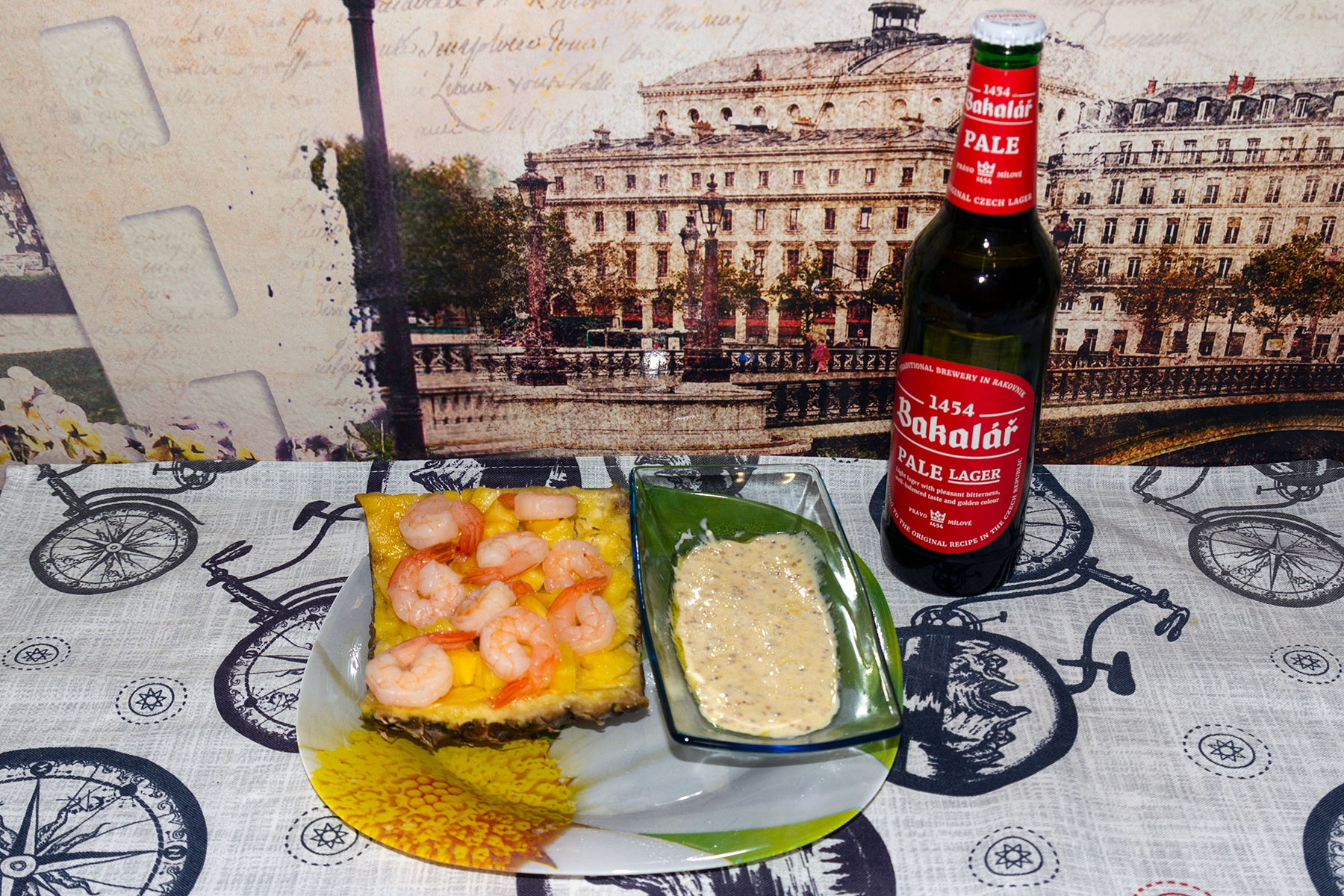 Ананас разрежьте вдоль пополам, мякоть выньте и нарежьте ломтиками. Креветок отварите в подсоленной и подкисленной лимонным соком воде, очистите.