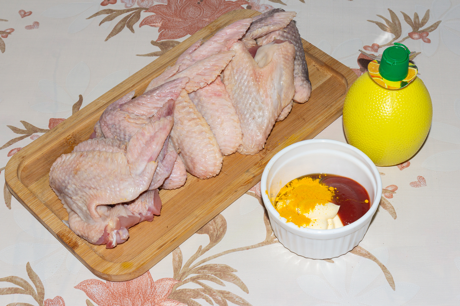 Крылышки промойте, обсушите и разрежьте по суставу. Смешайте лимонный сок, куркуму, аджику, мед и майонез. Залейте крылышки полученной смесью и маринуйте на холоде не менее 4 часов.