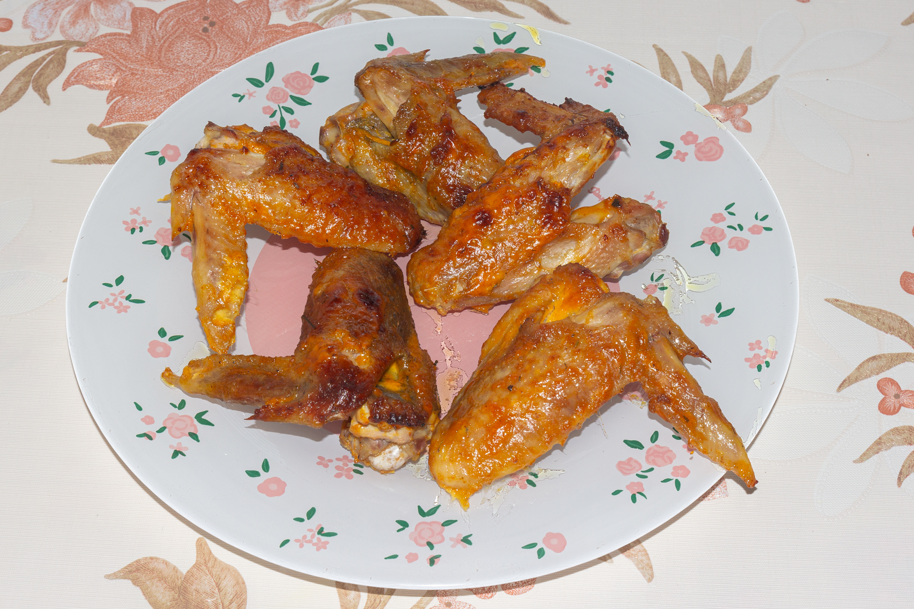 Подготовленные крылышки уложите на смазанный маргарином противень и запекайте в духовке при 220°C до образования румяной корочки.