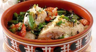 Курицу разрубите на порционные куски и сварите до полуготовности. Фасоль нарежьте и отварите в подсоленной воде. Мелко рубленный лук спассеруйте на масле в течение 2-3 минут. Помидоры ошпарьте, очистите от кожицы, нарежьте дольками и обжарьте вместе с луком. Соедините курицу с подготовленными овощами, мелко рубленной зеленью, посолите, поперчите и доведите до готовности.