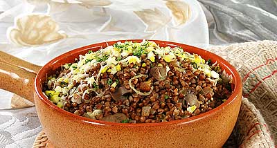 В гречневую кашу добавьте жареный лук, пассерованные грибы, шкварки, размешайте и уложите в керамические горшочки.