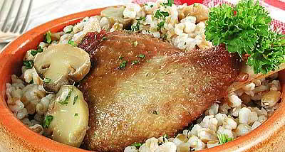 В горячую кашу добавьте обжаренный лук, масло и куски жареного гуся. Разложите по керамическим горшочкам и все прогрейте в духовке. Перед подачей на стол оформите зеленью.