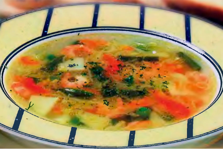 • В кипящий бульон положите нашинкованную капусту, а когда бульон закипит снова, добавьте обжаренные овощи, нарезанный брусочками картофель и нарезанные стручки фасоли.