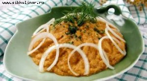 В картофель вбить яйца, всыпать манку, соль. Добавить яблоки, перемешать. Выпечь блины на смазанной жиром сковороде. К блинчикам подать сметану, мед, варенье из брусники.