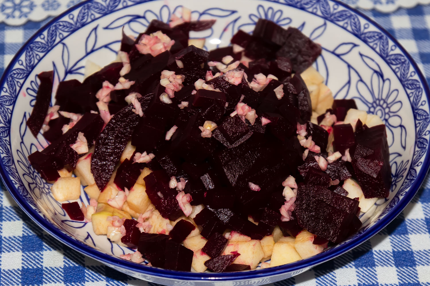 Отварную свеклу и очищенные яблоки нарезать соломкой или натереть на терке,