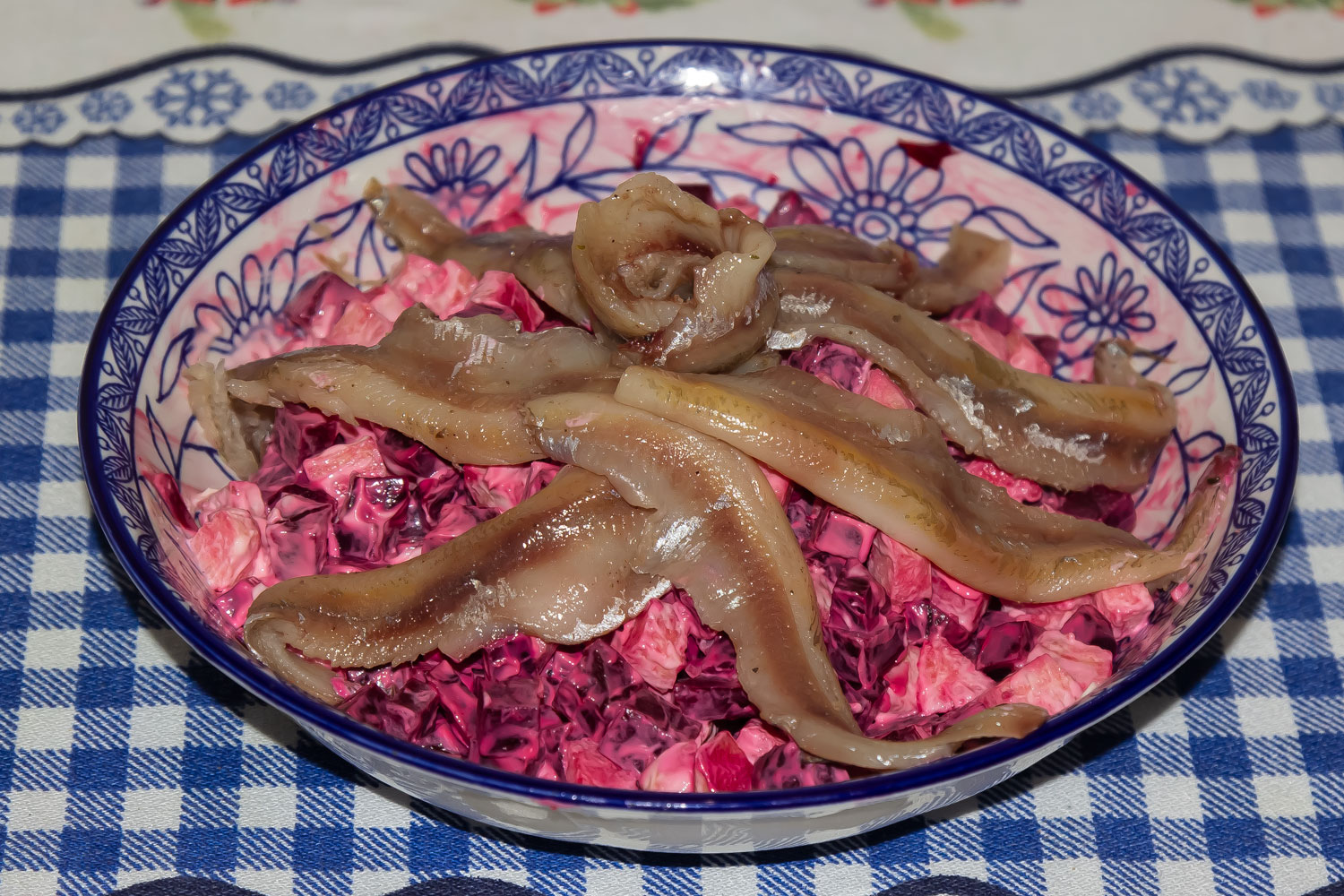 смешать с рубленым чесноком и заправить майонезом. На горку винегрета выложить кусочки очищенной мякоти мойвы.