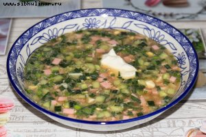 На 1л кваса берут 5-6 листьев огуречной травы, 2 листа листовой горчицы, 4-5 листьев салата, 30г зеленого лука, 10-15г укропа, 2 яйца, 1 картофелина, 30-40г мяса, сметана, соль и сахар по вкусу.