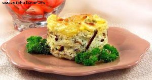Нагреть духовку до 180 градусов. В смазанную жиром форму выложить капусту, а сверху разложить перец, помидоры и бекон. Залить сырно-сливочной массой и посыпать оставшимся сыром. Запекать 25 минут.